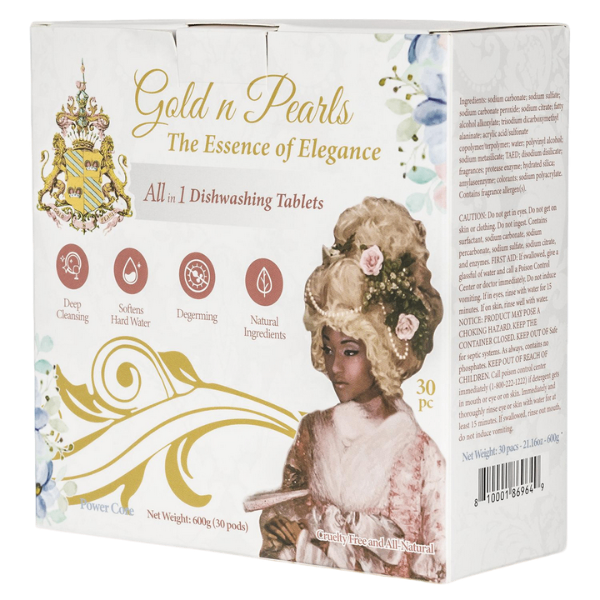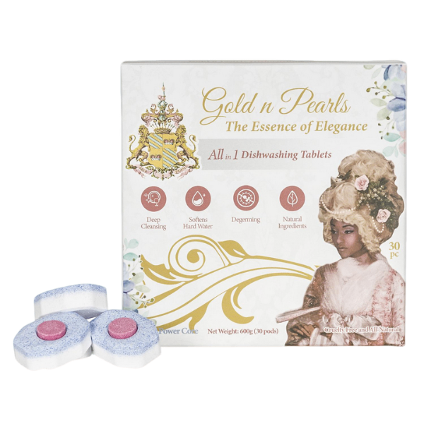 Gold n Pearls 3-Layer Dishwashing Tablets bring sophistication to the sink. Each tablet is pre-measured and individually wrapped, offering a seamless, mess-free experience with every use.